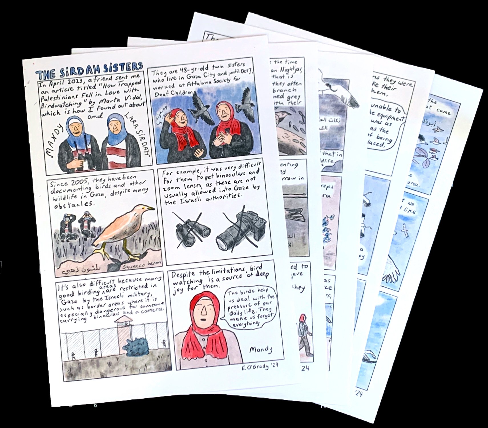 Since Oct 7 2023 Ellen O'Grady has been creating comics to inspire the work for a free Palestine, with an emphasis on how we care for ourselves and each other. During college Ellen studied in East Jerusalem, and after school she returned to Palestine where she spent seven years working with grassroots organizations, teaching art and witnessing the Palestinian struggle for liberation in Gaza and the West Bank.