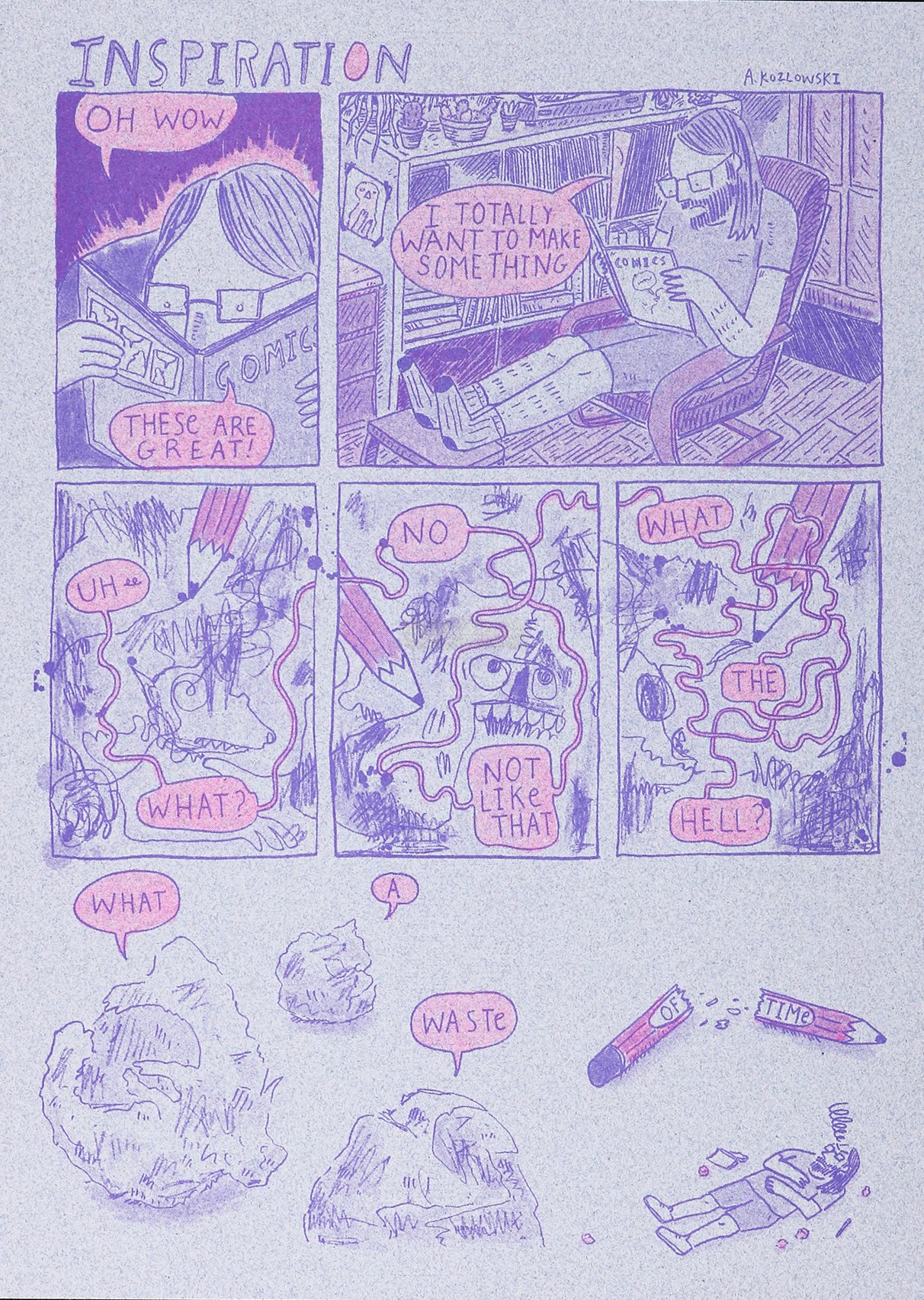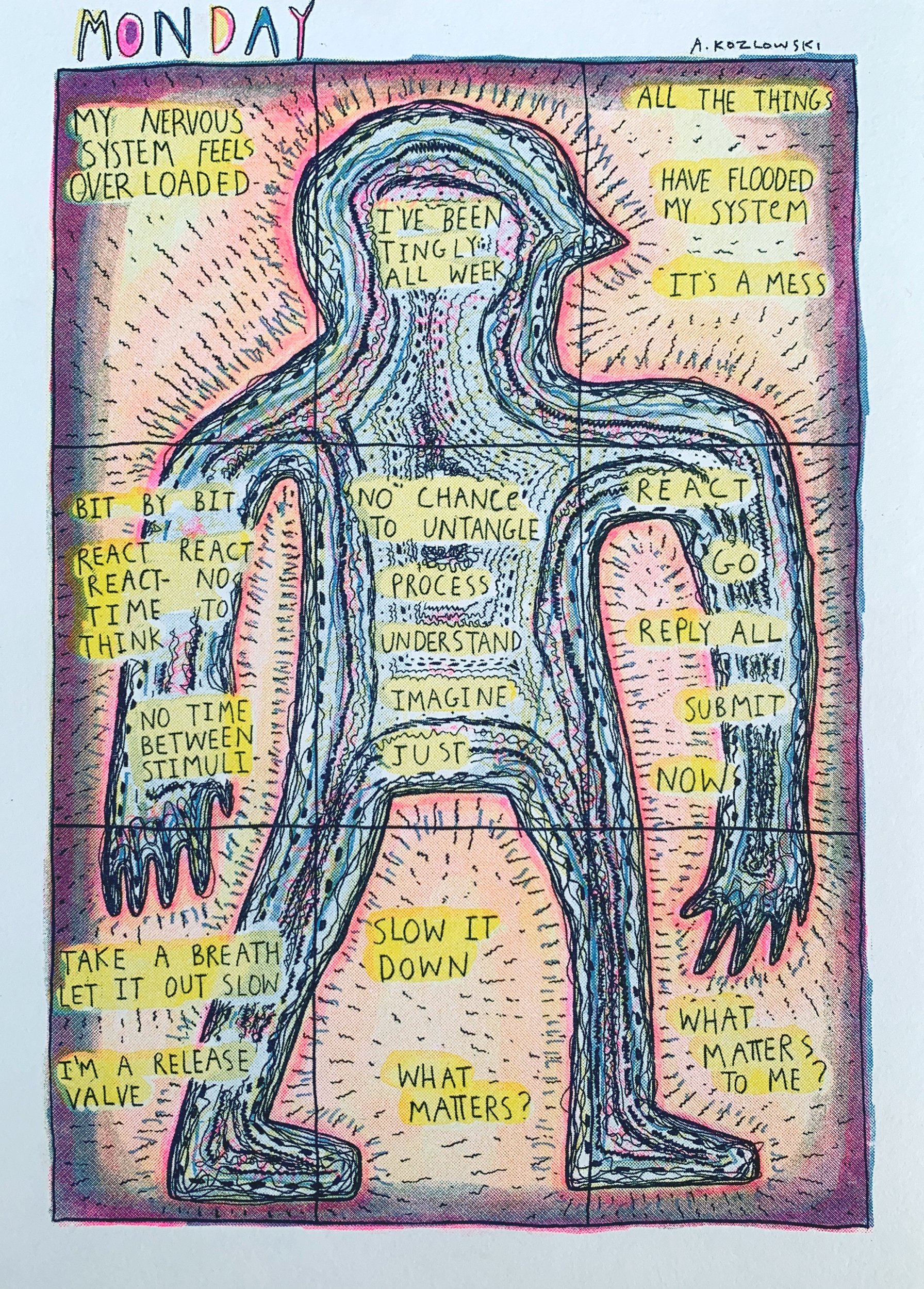 What can I say- I like printing! Various small riso prints measuring about 9"x6.5" printed in a variety of colors on different papers.
